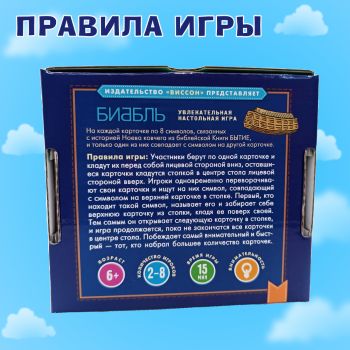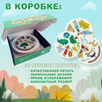 На каждой из 57 круглых карточек по 8 символов, связанных с героями, событиями и образами Ветхого Завета, и только один из них совпадает с символом на другой карточке.