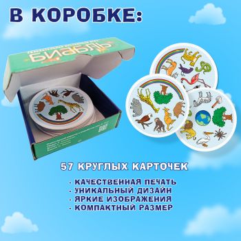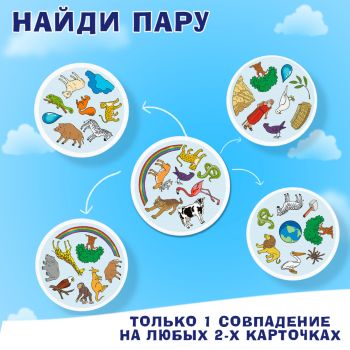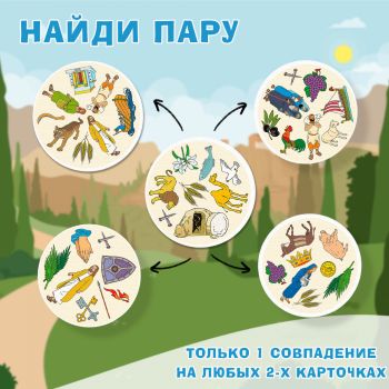 На каждой из 57 круглых карточек по 8 символов, связанных с историей Ноева ковчега, и только один из них совпадает с символом на другой карточке.