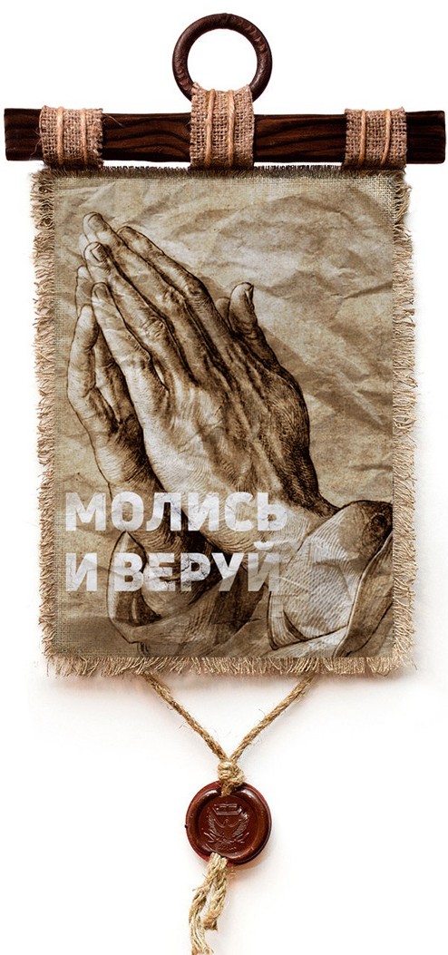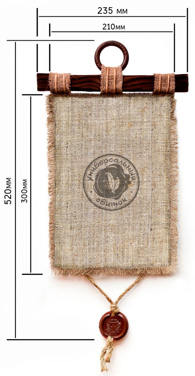 Специальная технология нанесения на льняную ткань и бахрома по краям превращают изображение в фактурное панно, а обожжённая деревянная рея в сочетании с тесьмой из плотной мешковины, джутовым шпагатом, и сургучным штампом на подвеске, в древний свиток.