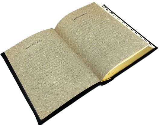 Оформление: Переплет из высококачественной черной кожи дополнен изысканным золотым обрезом, защищающим страницы от пыли и износа.