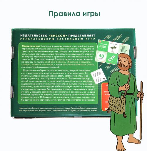 Участники назначают ведущего, который тщательно перемешивает большие карточки и раздает их игрокам. У ведущего на руках остаются маленькие карточки с вопросами. Каждый игрок может взять столько карточек, сколько позволяют его возможности отвечать на вопросы ведущего быстро и правильно, и должен внимательно изучить их. На 6-ти полях каждой большой карточки он найдет ответы на вопросы по темам: «События Библии», «Животные и предметы», «Цифры», «Имена и топонимы», а также окончание библейской цитаты, начало которой озвучивает ведущий.