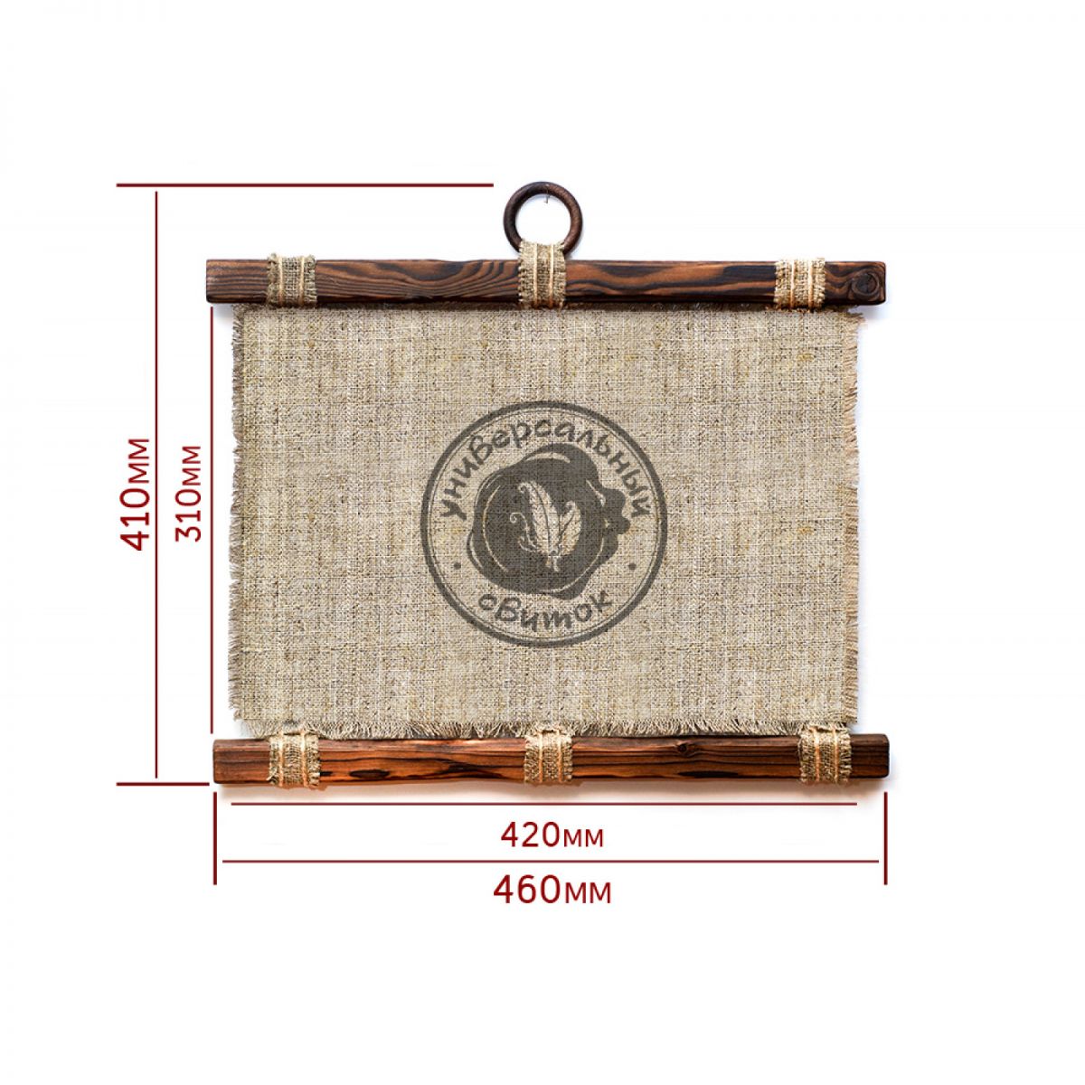 Специальная технология нанесения на льняную ткань и бахрома по краям превращают изображение в фактурное панно, а обожжённая деревянная рея в сочетании с тесьмой из плотной мешковины, джутовым шпагатом, и сургучным штампом на подвеске, в древний свиток.