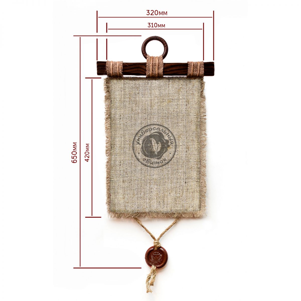 Специальная технология нанесения на льняную ткань и бахрома по краям превращают изображение в фактурное панно, а обожжённая деревянная рея в сочетании с тесьмой из плотной мешковины, джутовым шпагатом, и сургучным штампом на подвеске, в древний свиток.