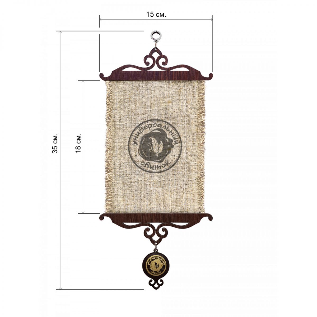 Специальная технология нанесения на льняную ткань и бахрома по краям превращают изображение в фактурное панно, а обожжённая деревянная рея в сочетании с тесьмой из плотной мешковины, джутовым шпагатом, и сургучным штампом на подвеске, в древний свиток.