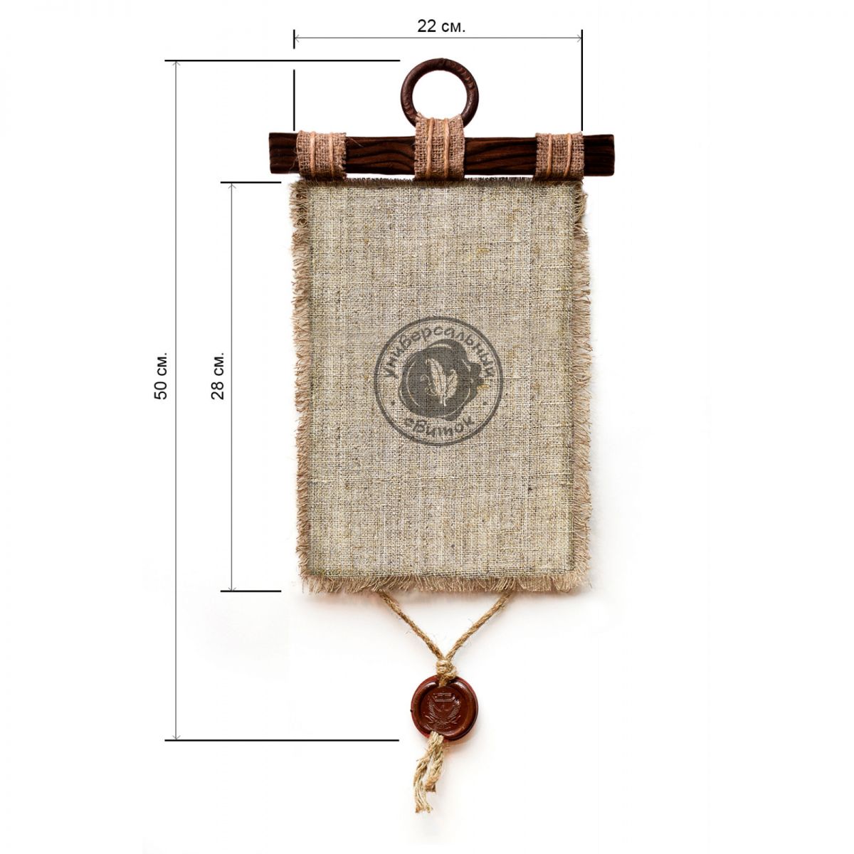 Специальная технология нанесения на льняную ткань и бахрома по краям превращают изображение в фактурное панно, а обожжённая деревянная рея в сочетании с тесьмой из плотной мешковины, джутовым шпагатом, и сургучным штампом на подвеске, в древний свиток.